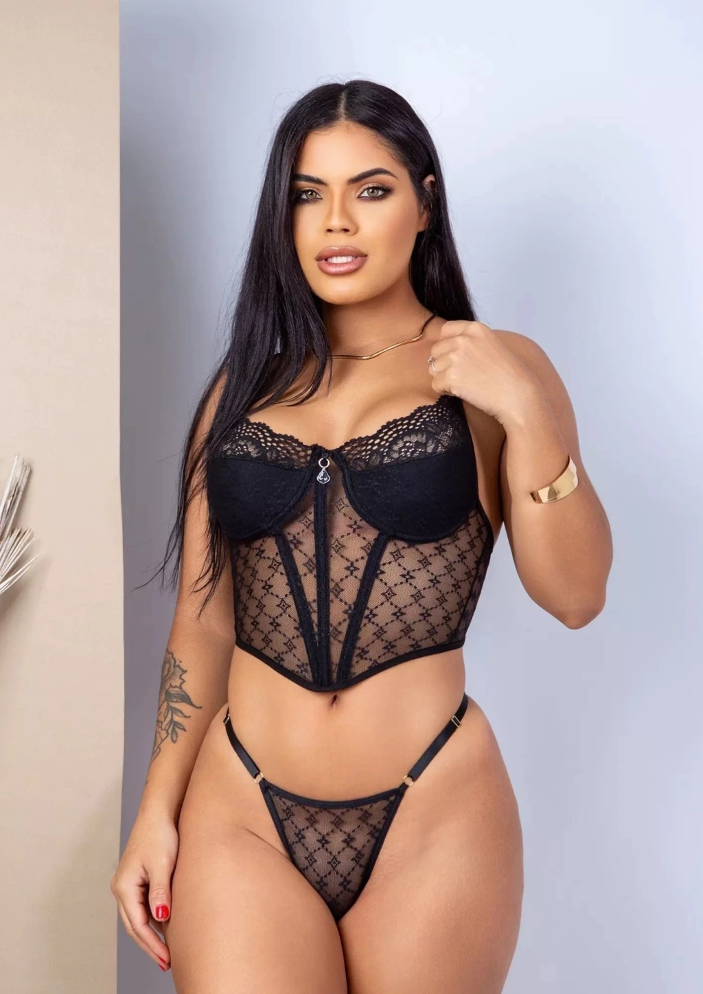 Arrase na sedução com o Conjunto Corselet Louis Vuitton Preto! Este conjunto é puro charme e conforto, feito em tule com detalhes em renda que deixam o decote simplesmente irresistível. Com três barbatanas frontais para dar aquela sustentação poderosa, alças reguláveis com metal dourado que brilham mais que suas ideias e um colchete duplo para segurança total. O busto é forrado com algodão, porque conforto nunca é demais!