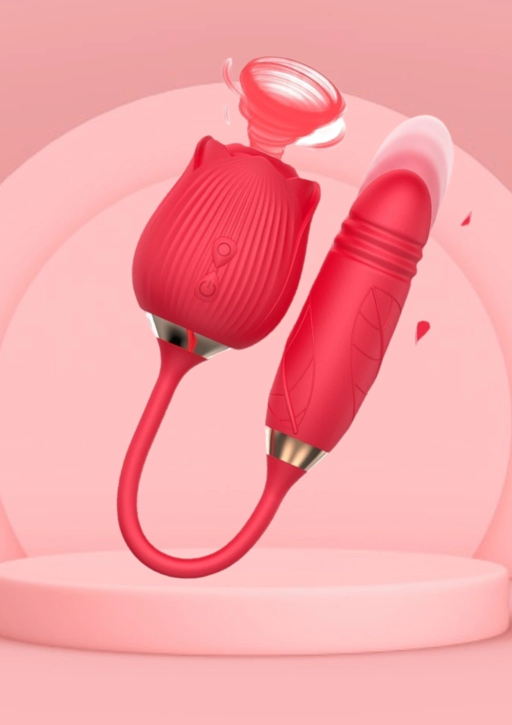 Vibrador em formato de rosa vermelho com estimulador de clitoris atraves de pulsação (sugador) com estimulador de ponto G atraves do vai e vem